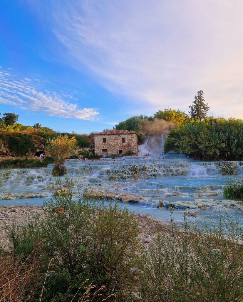 Die Thermalquellen von Saturnia in der Toskana sind natürliche, schwefelhaltige Warmwasserquellen, deren Wasser konstant etwa 37 °C warm ist. Berühmt sind vor allem die Cascate del Mulino, terrassenartige Kalksteinbecken, in denen das mineralreiche Wasser frei zugänglich herabfließt. Die Quellen sind für ihre entspannende Wirkung, die idyllische Landschaft und das milchig-blaue Wasser bekannt – ein beliebtes Ziel zum Baden inmitten der Natur.